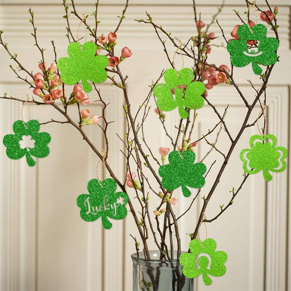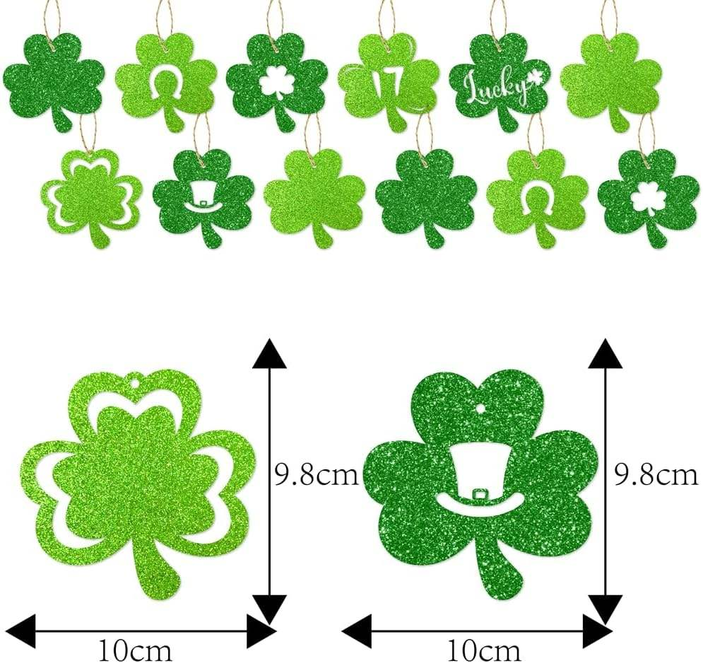 The St. Patrick’s Day hanging ornament featuring the “green clover” has a size of 10cm * 9.8cm. It comes with a hemp rope hanger. It can be used as a home decoration, party setup, or window decoration for St. Patrick’s Day. It can also serve as a decorative accessory for DIY holiday crafts. The cardstock material is lightweight and easy to install, and it can be reused.