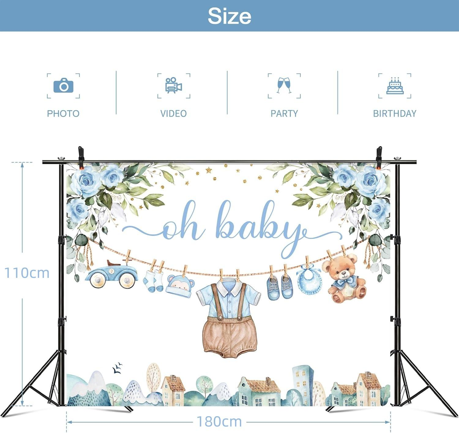 Baby shower party backdrop measures 180*110cm, featuring blue floral watercolor in a cartoon style, creating a warm life scene, made of soft fabric, reusable, machine washable, and easy to carry.