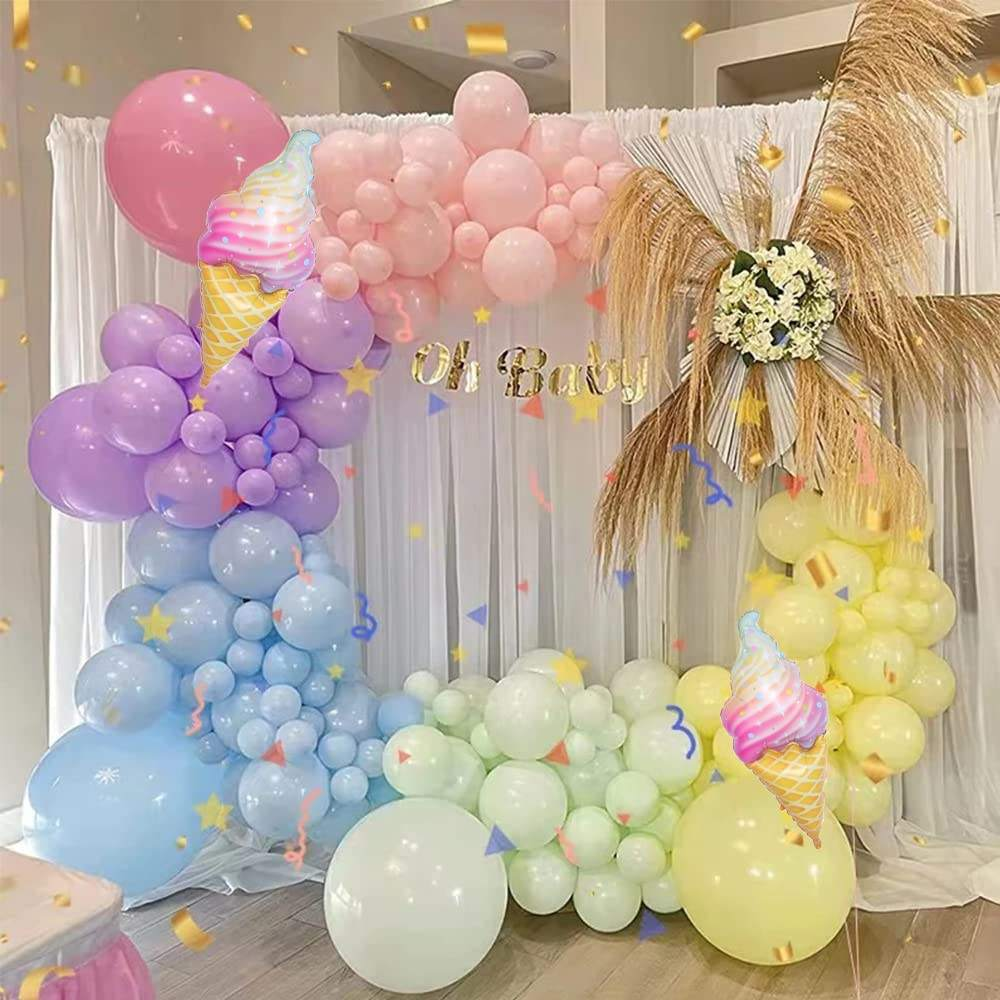 143 pcs rainbow-coloured macaron balloon decoration garland arch party backdrop decorations, with pink, blue, green, yellow, and purple balloons, suitable for decorating holidays, parties, and graduations.