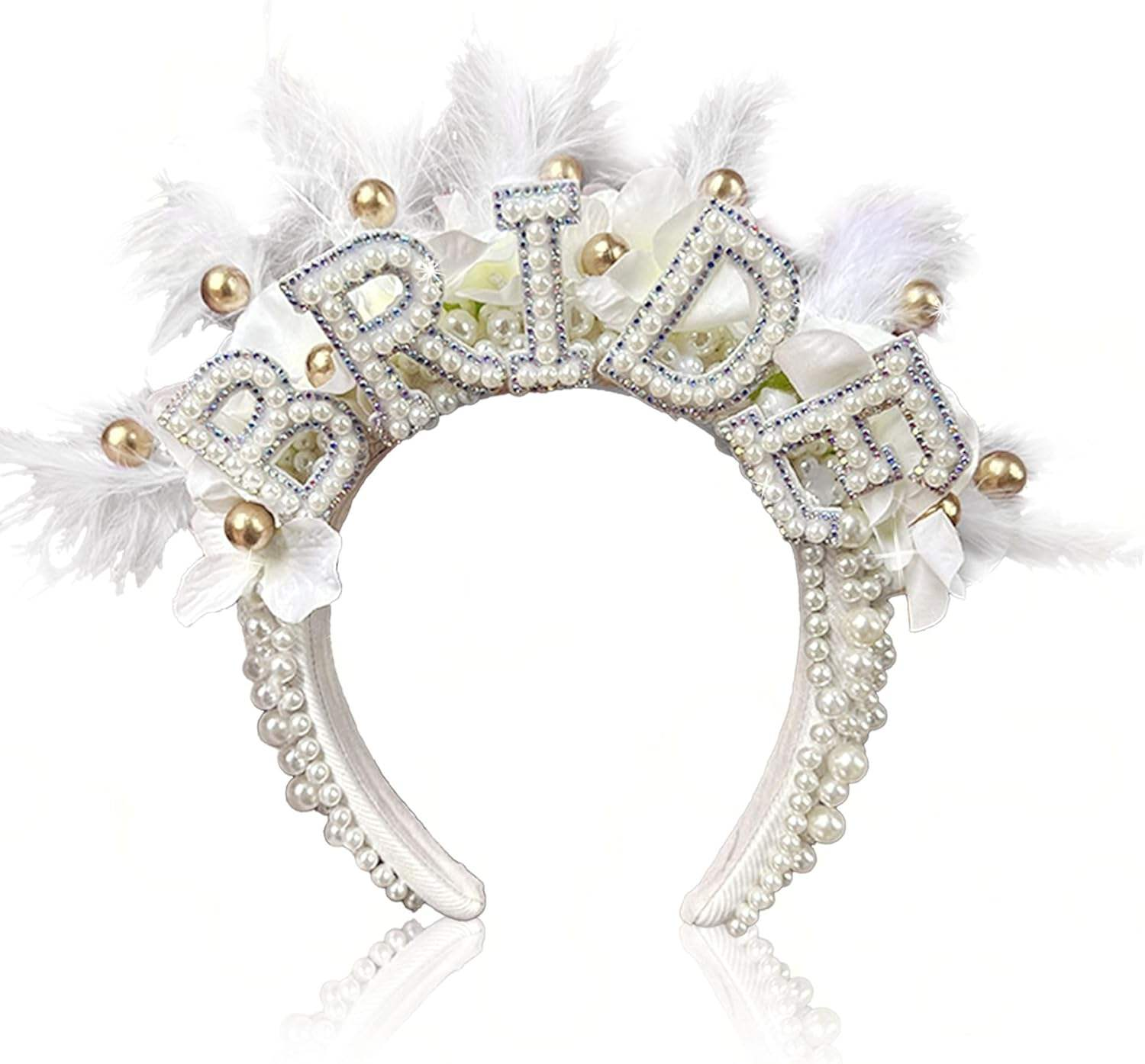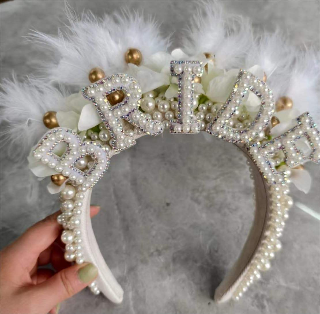This bridal headband is hand-embellished with pearls and rhinestones, adorned with white feathers, artificial flowers and golden beads, giving it a full and delicate appearance. It measures 21*20*4cm and is suitable for a variety of wedding themes such as romantic and vintage.