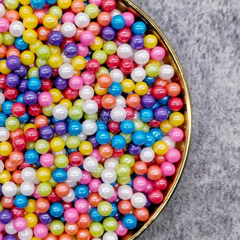 Wholesale bubble gum edible coloured mixed beads, available in a variety of colours including gold, white, pink, blue and purple, packaged in boxes, suitable for party supplies.