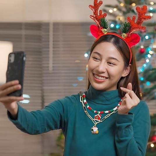 Christmas beads necklace features a three-color bead and double-layer design, paired with Santa Claus and Christmas tree pendants. The style is lively and cute. It is suitable for Christmas outfits and can also be given as a gift. It is a popular decorative accessory.