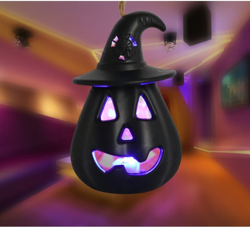 The double face LED plastic pumpkin night light is mainly black and orange, with hollow patterns on the surface that are both cute and spooky, and it comes with a jute hanging rope on top. It is very small, easy to place and hang, can be used as a desktop ornament, and is also suitable for party decoration or window display.