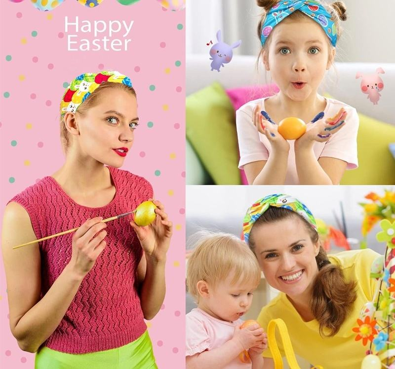 Easter Cute Bunny Rabbit Egg Cross Wide Knotted Headband Cartoon Printed Knot Elastic Headband for Easter Party Hair Accessories