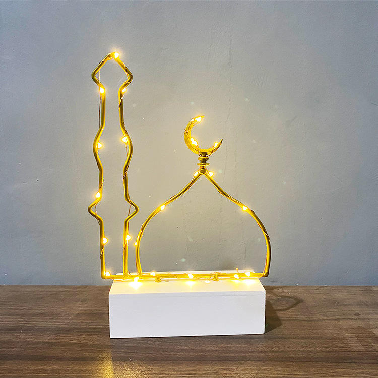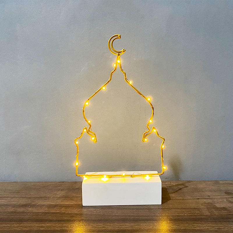 Eid Mubarak lights string decorations feature a core design of temple architecture and moon, outlined with golden metal lines and paired with warm LED string lights, presenting an elegant exotic style, with a white square base that is stable and easy to place.