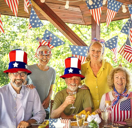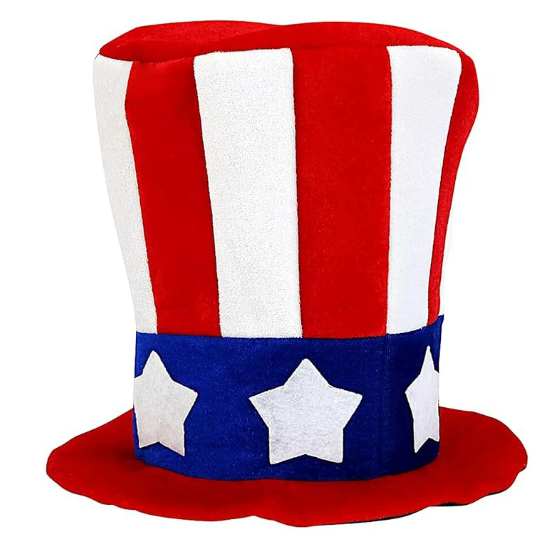 The flag hat is made of soft plush, comfortable to touch and three-dimensional in shape, featuring red and white vertical stripes and blue and white ribbons with white stars, making it perfect for American Independence Day, national day themed parties, and cosplay.