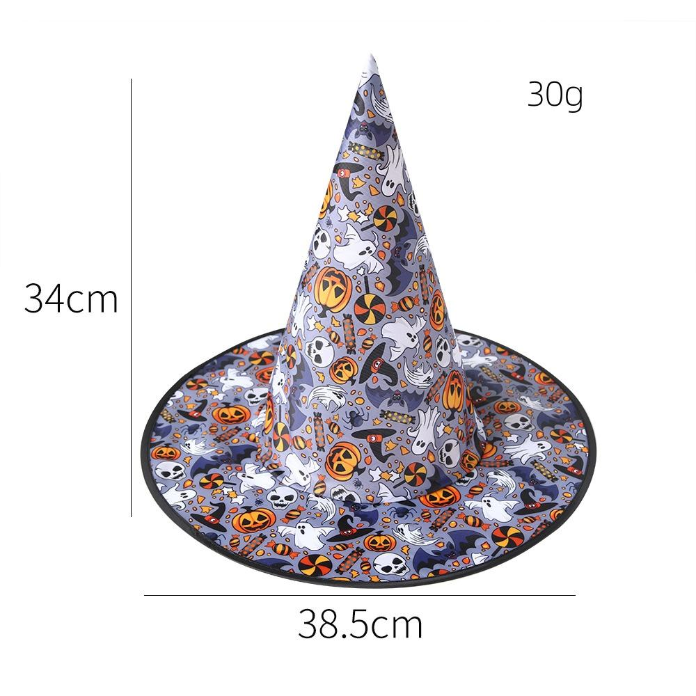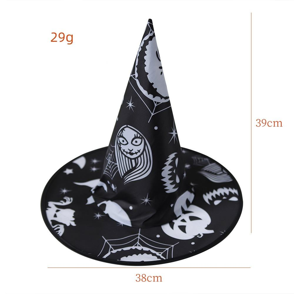 Designed with a Halloween theme, this witch hat pattern features prints of ghosts, skeletons, bats, spider webs, and more, in colours of black, purple, and orange, with lace on the brim and a belt buckle design, adding depth to the shape. Suitable for Halloween parties and cosplay outfits.