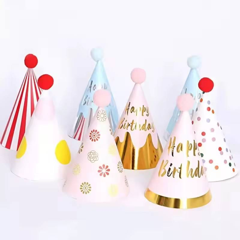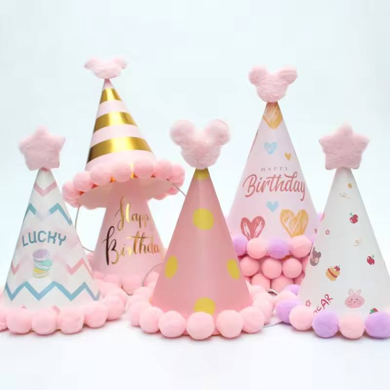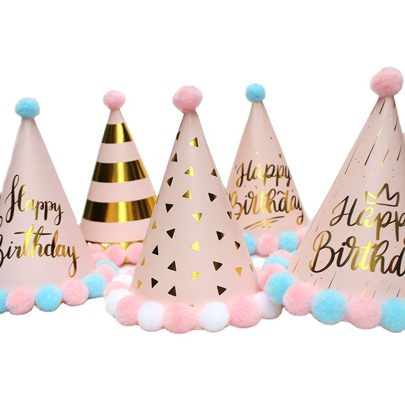 This is a high-quality happy birthday cone hat made of thick cardboard, which is not prone to deformation. It is decorated with different colored fluffy balls, making it both cute and exquisite. The size of 14*16.5cm is suitable for both adults and kids. It can be used as an accessory or decoration for party outfits, or as a great photography prop.
