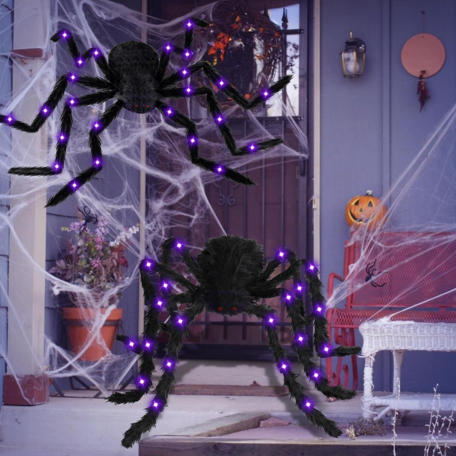 Halloween glowing large plush spider web outdoor decoration, fuzzy spider prop, visually striking and extremely spooky, spider legs can be bent and shaped, foldable for easy storage, suitable for Halloween home entrance decoration and party venue setup.