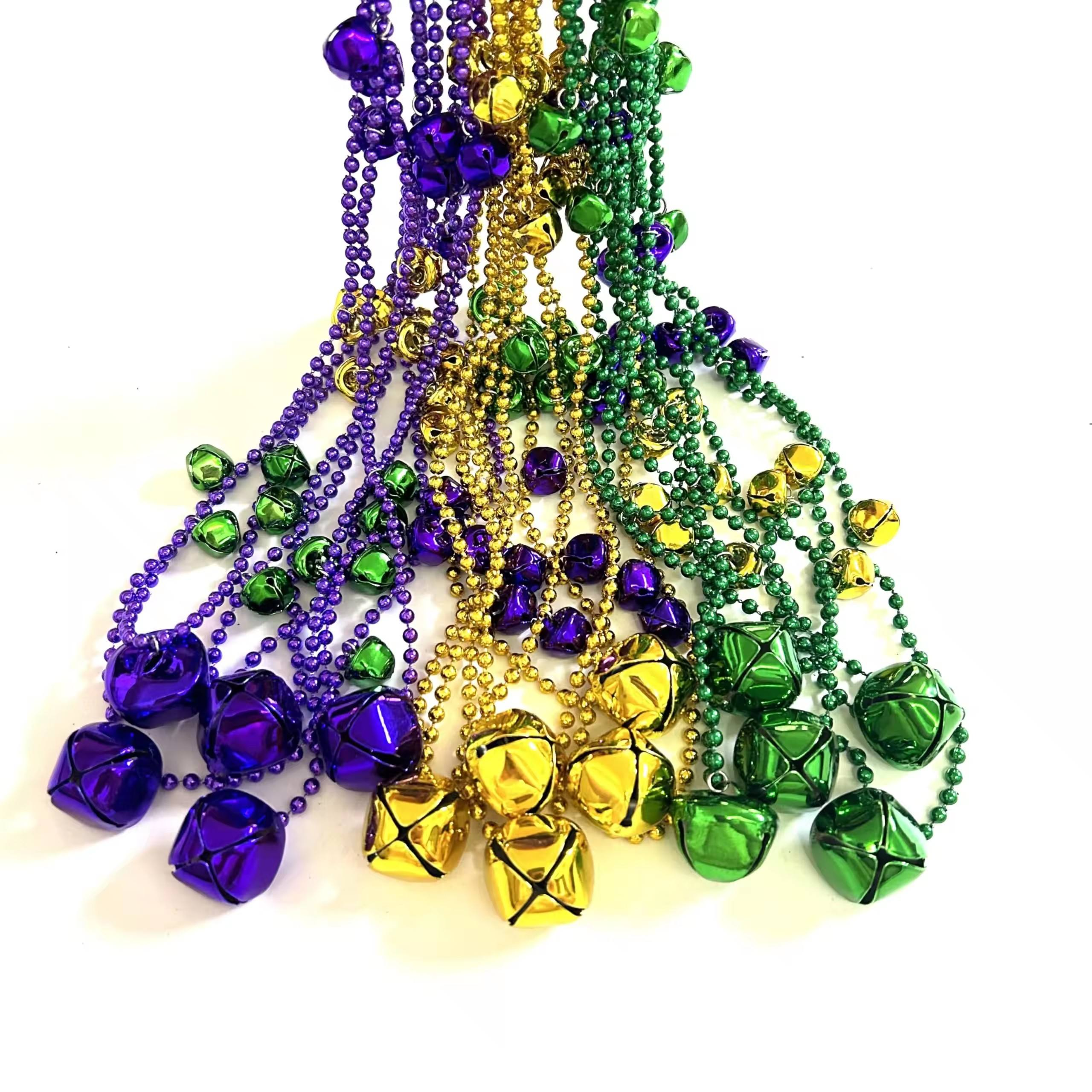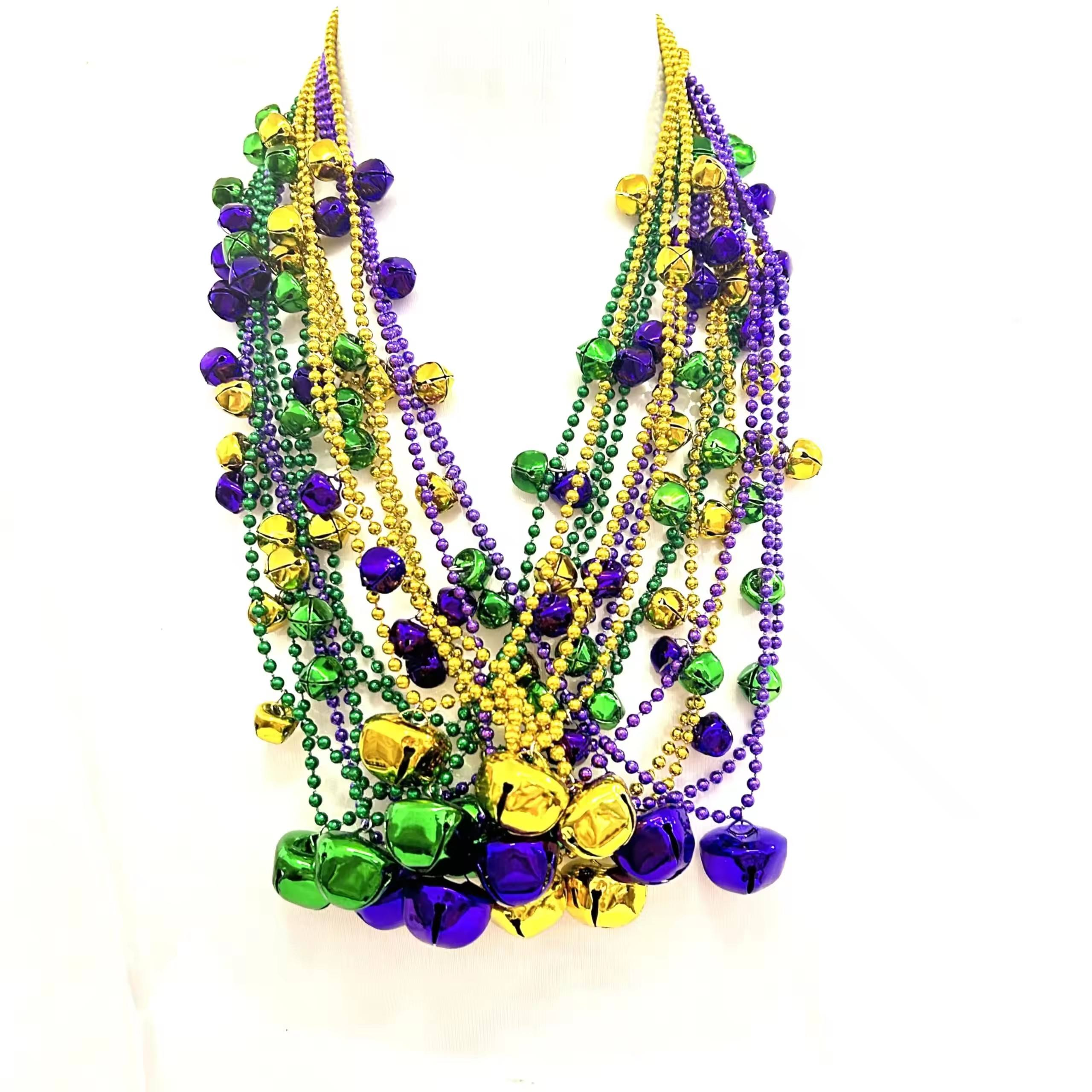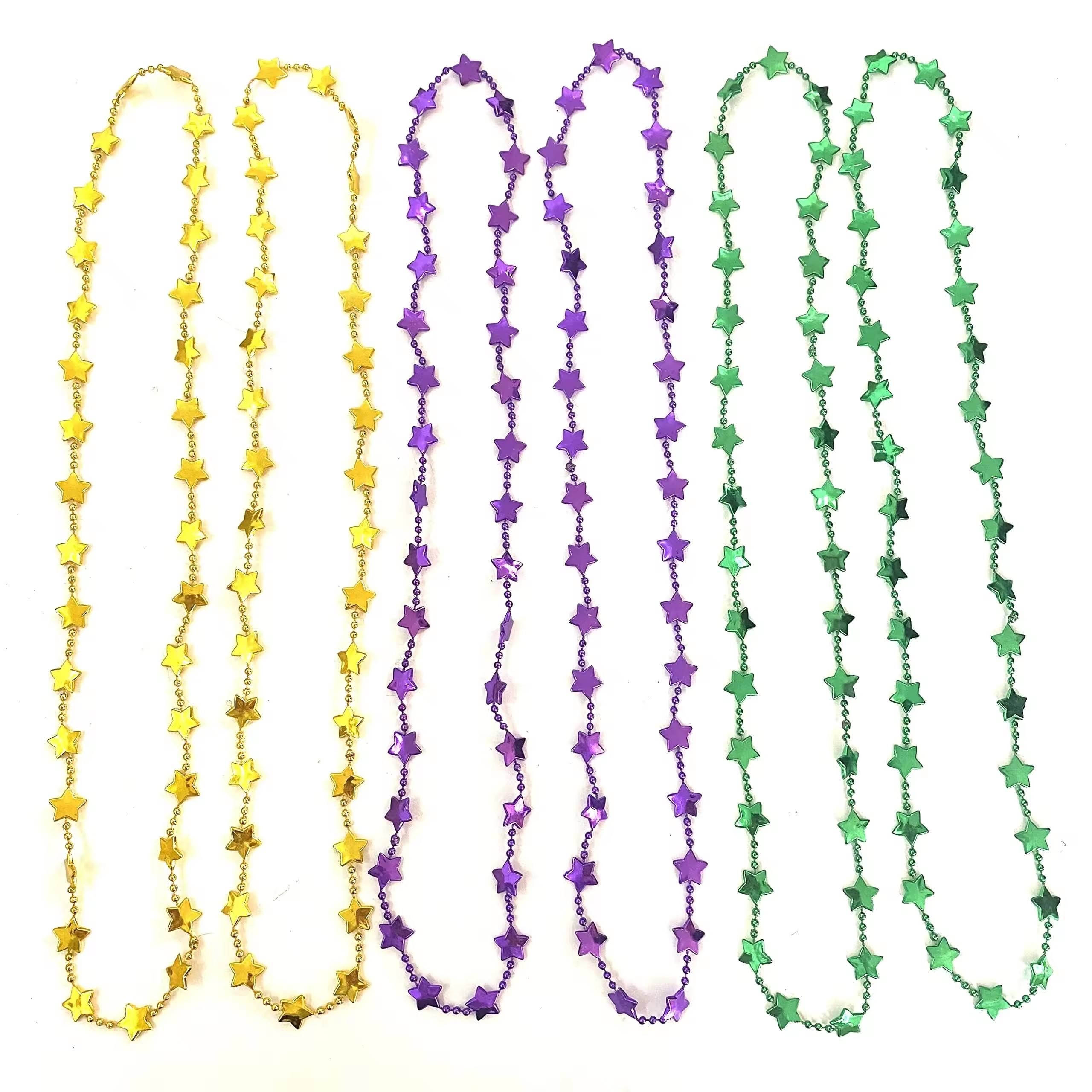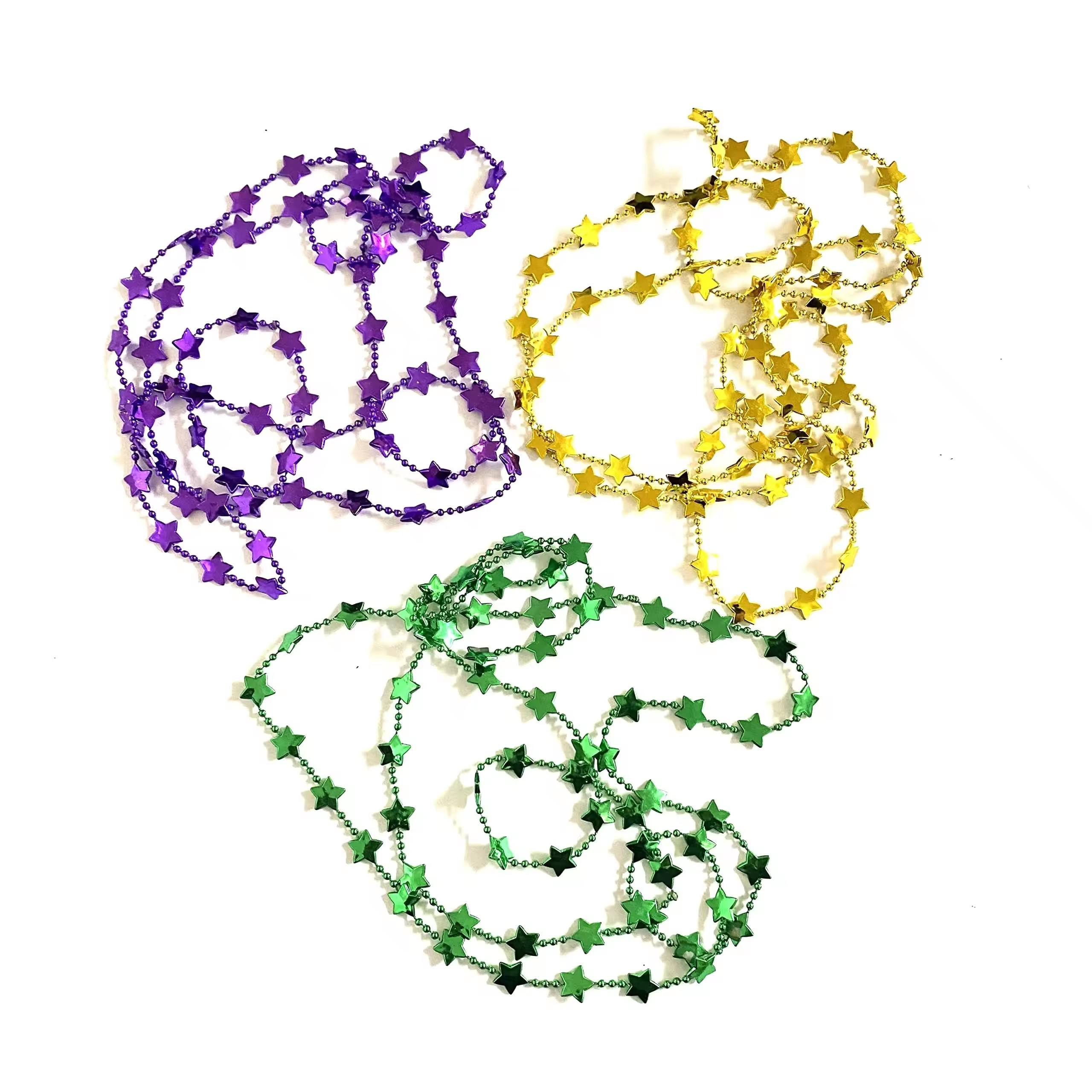 The Mardi Gras plastic star bell bead necklace is available in gold, purple and green, usually designed as a long chain, which can be worn singly or layered, suitable for carnival parties and festive occasions.