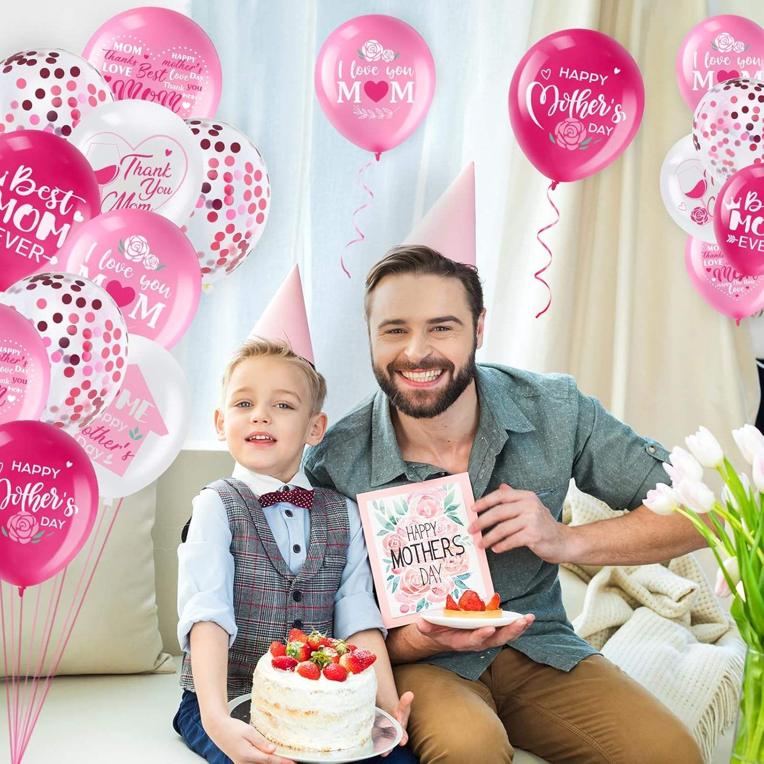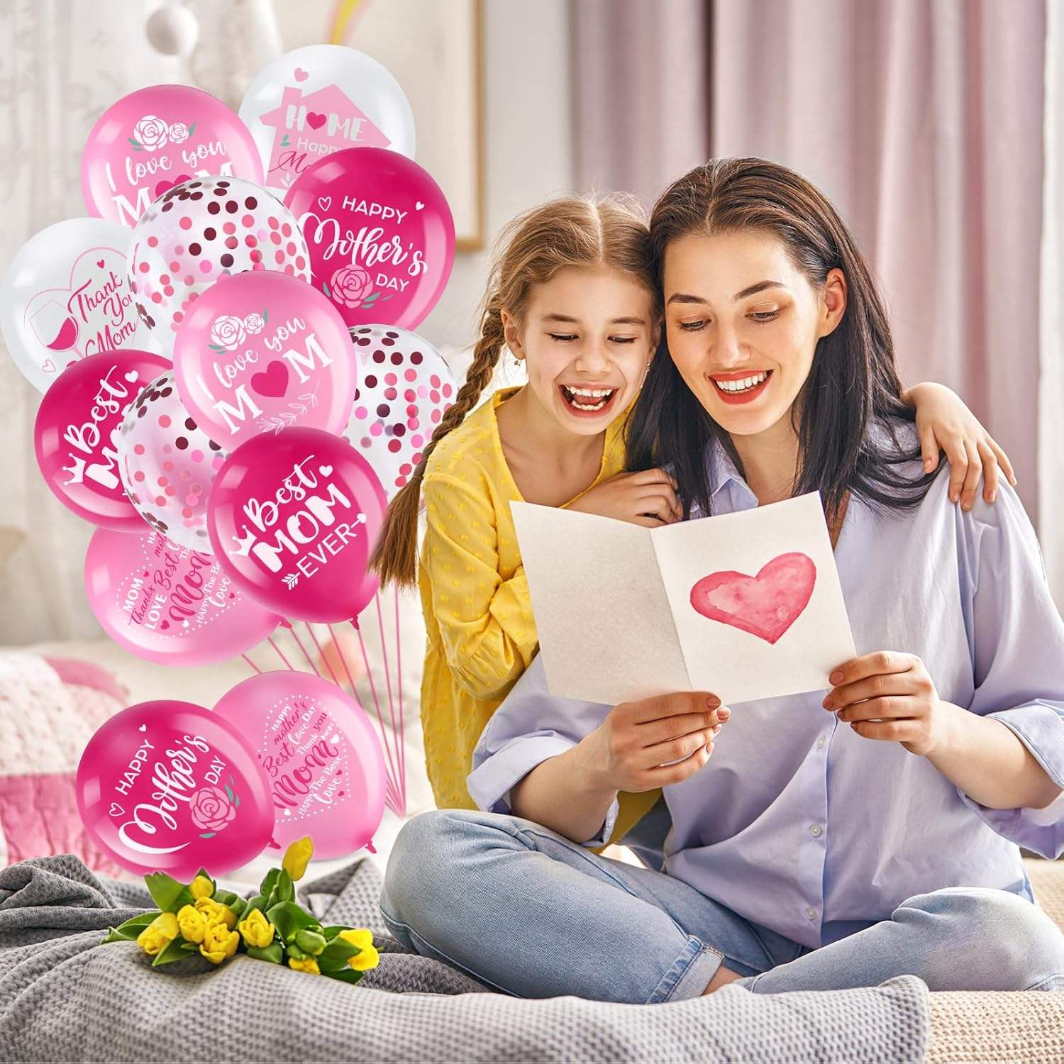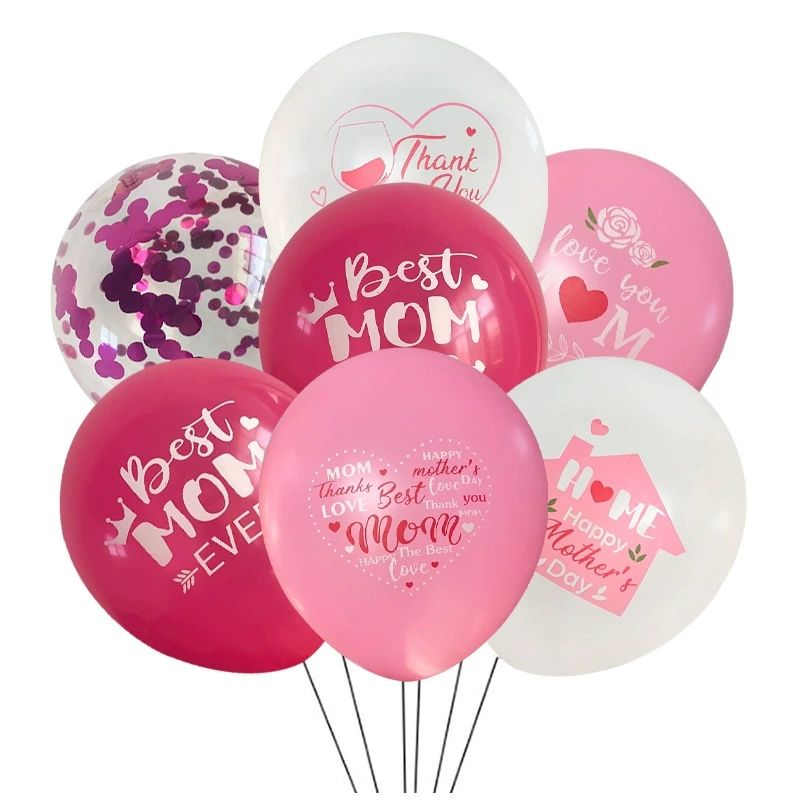 This Mother’s Day balloons set is 12 inches in size, primarily in white and pink, made of high-quality latex, suitable for holidays and party decorations.