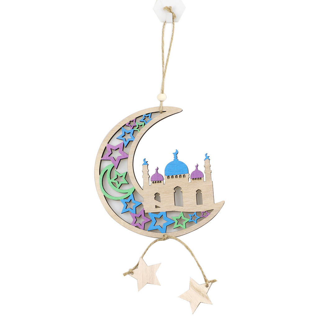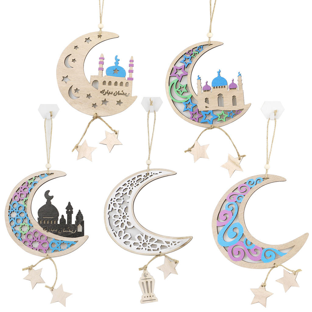 The Mubarak Ramadan moon star hanging decoration uses wood carving techniques to achieve delicate hollow patterns, complemented with star and lantern pendants, creating a refined style full of festive atmosphere. Each piece comes with an individual hanging cord, allowing flexible use.