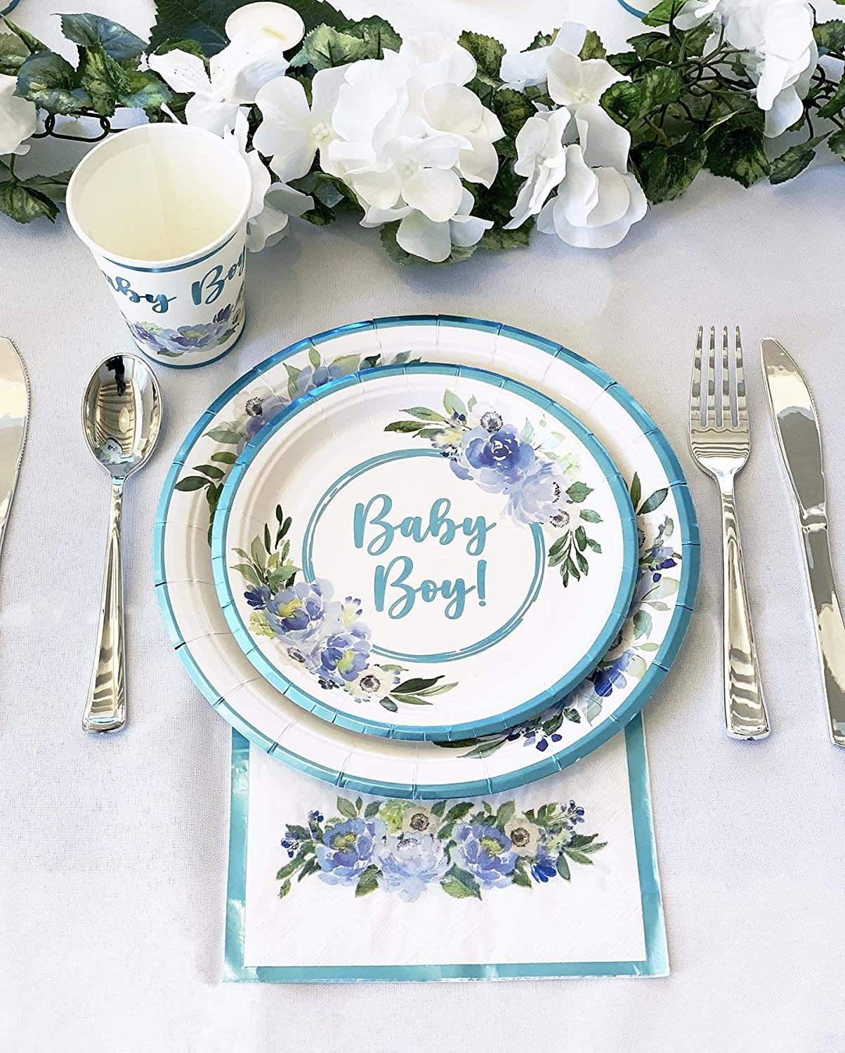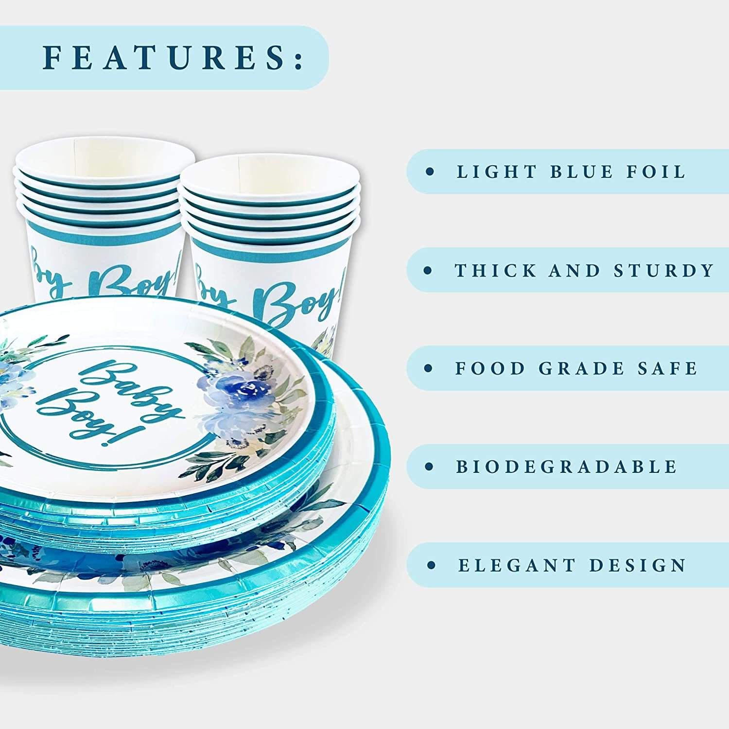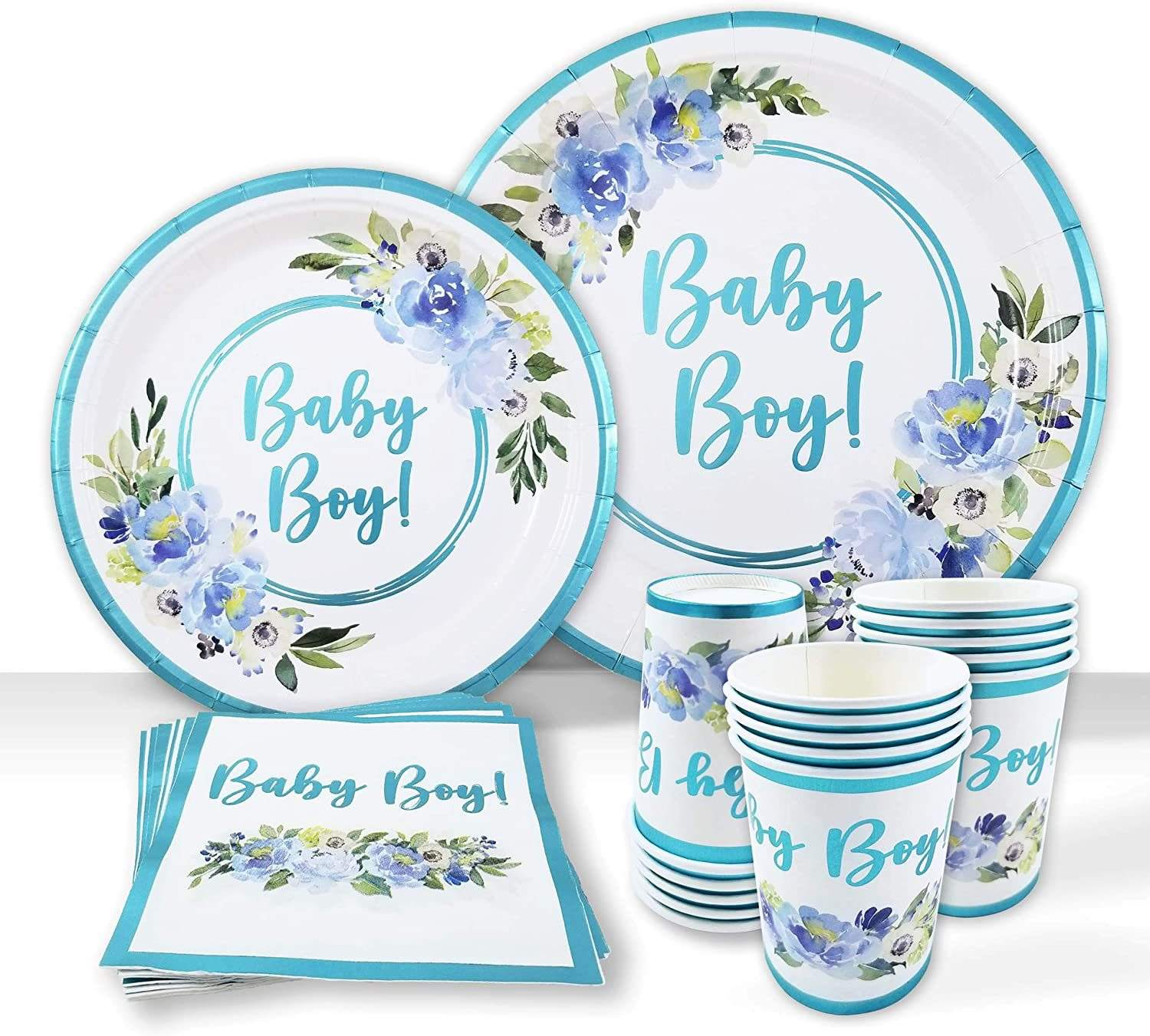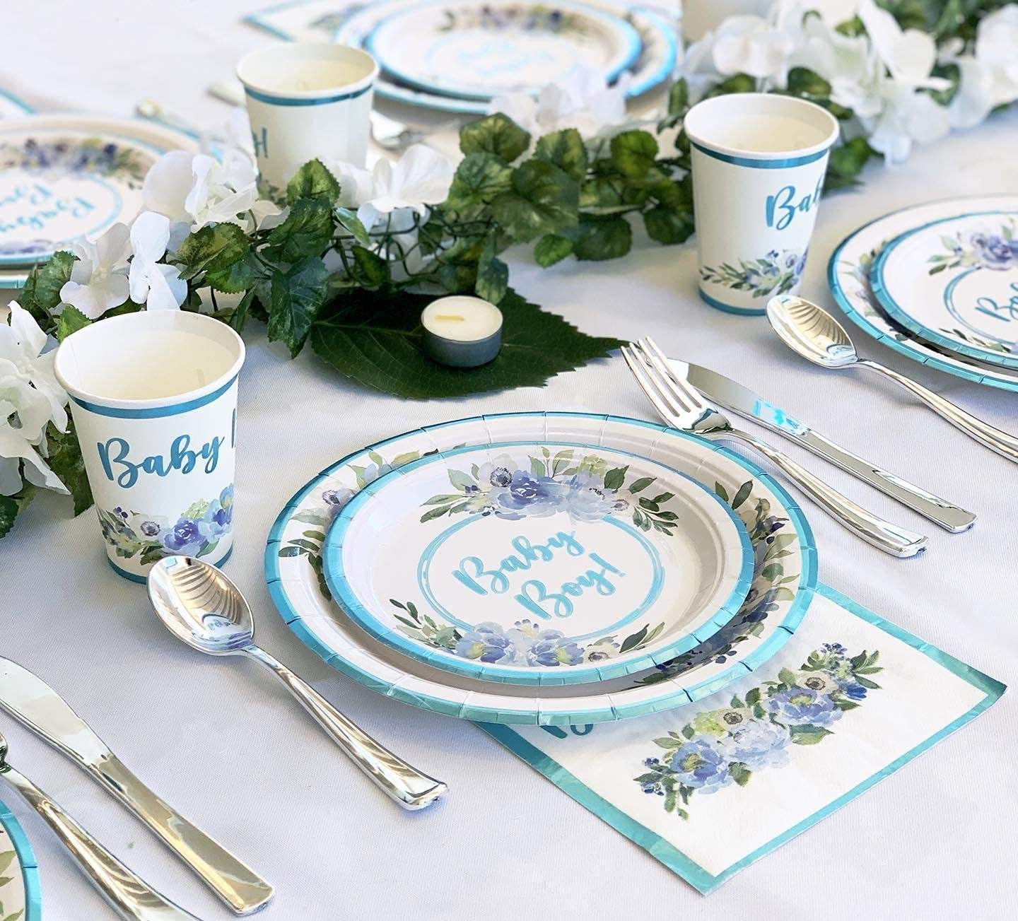 This is a disposable set of decorative tableware specially designed for baby shower, including large and small plates, napkins and cups. The color is mainly in fresh blue, and the logo is printed by silk screen printing, customized logos are available. The material is thick food-grade paper, which is lightweight, durable and does not require cleaning. It can be directly discarded after the party, saving time for tidying up.