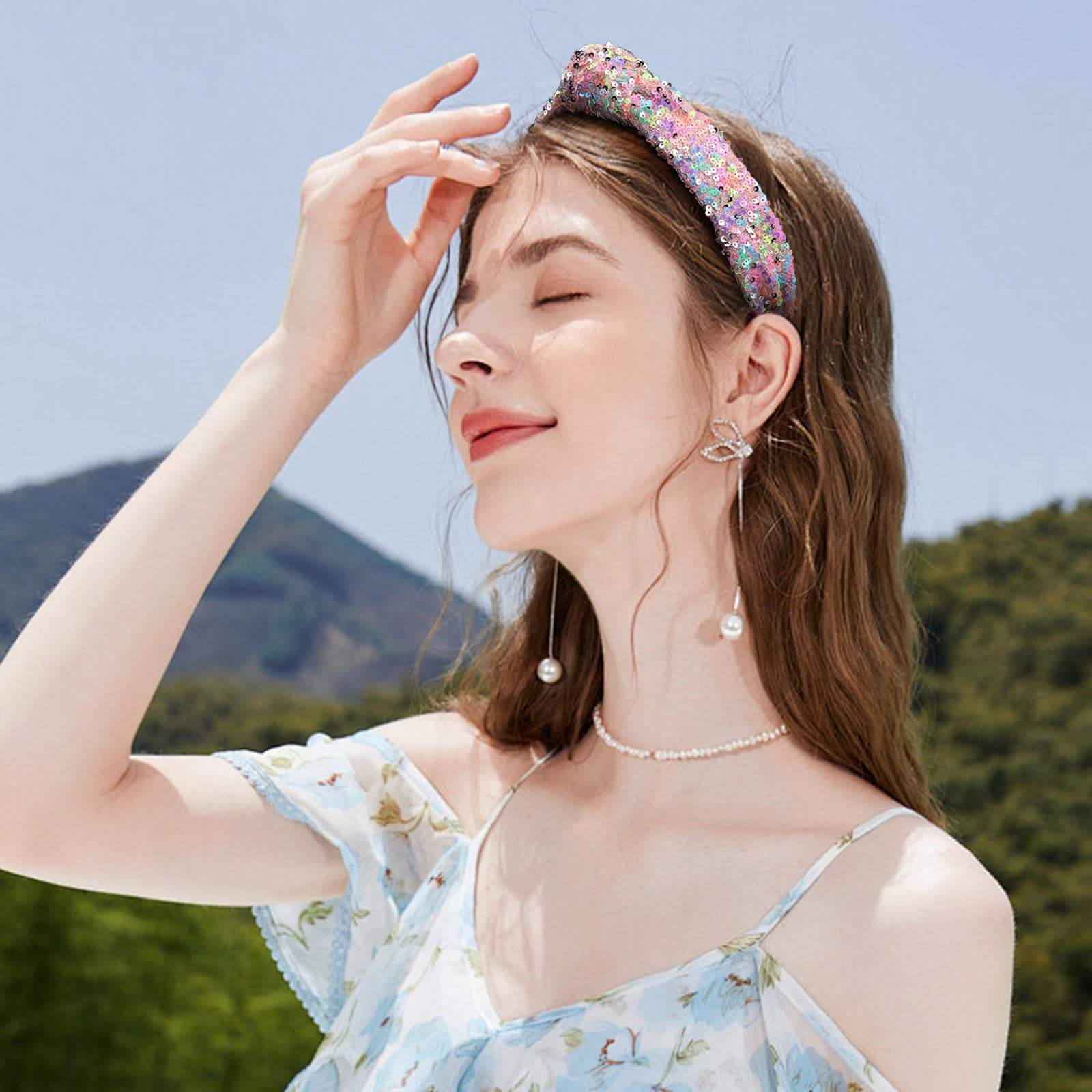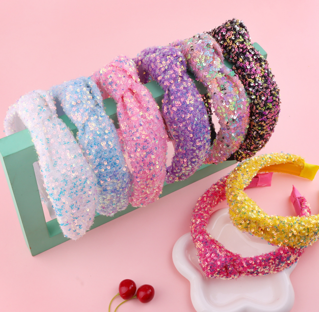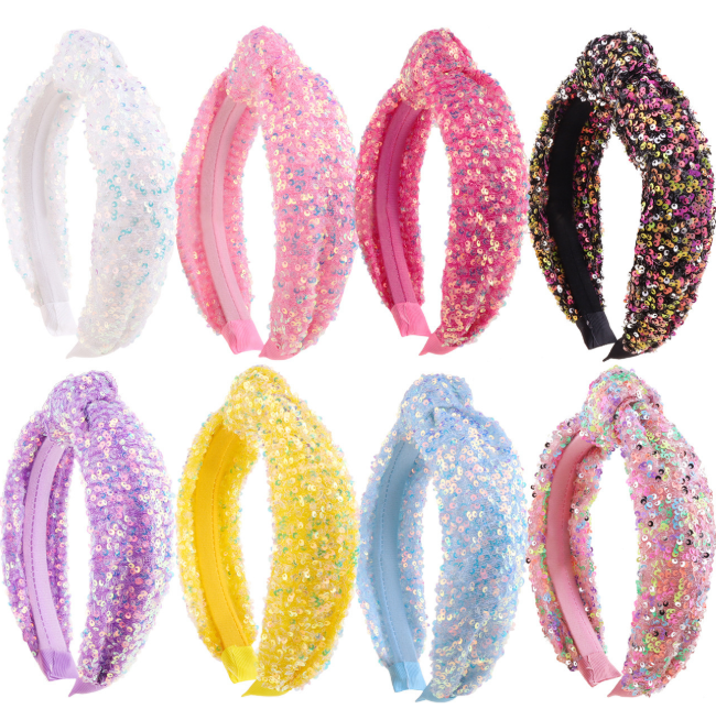 These rainbow knotted hair bands come in a variety of colours, suitable for different styles of dress, with a surface covered in sequins, making them eye-catching, ideal for parties, dates, festivals and other occasions as adornment.