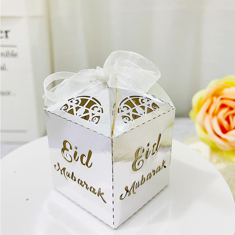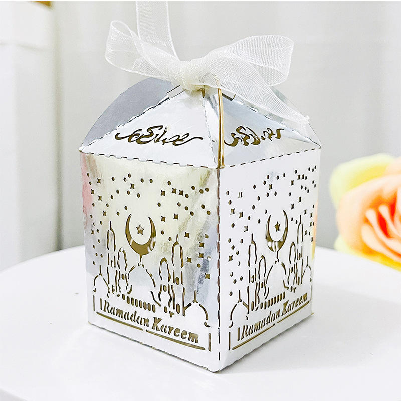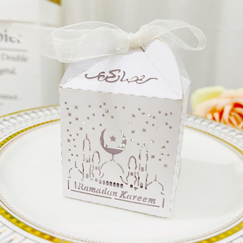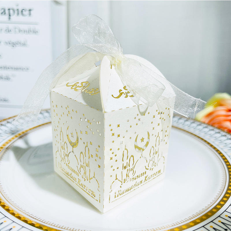 The Ramadan gift box features a hollow design and metallic printing, paired with a white ribbon bow, making it very delicate and perfect for packaging favours for Eid or Ramadan parties, where it can hold candies, nuts, and small gifts.