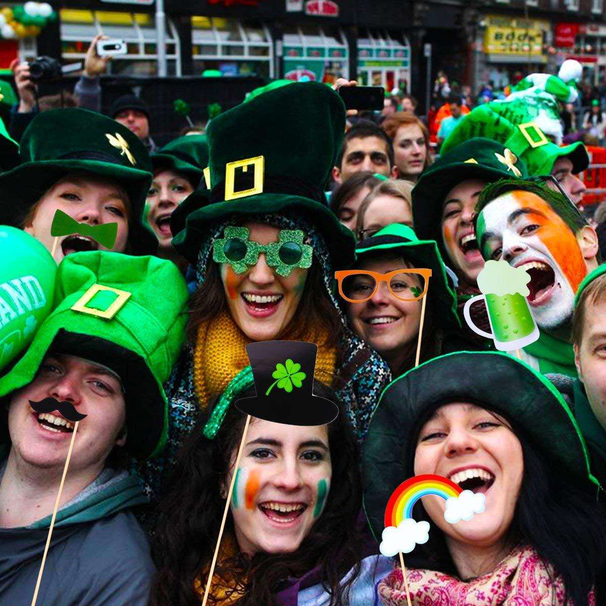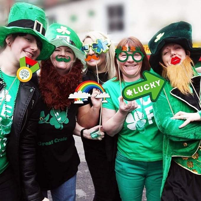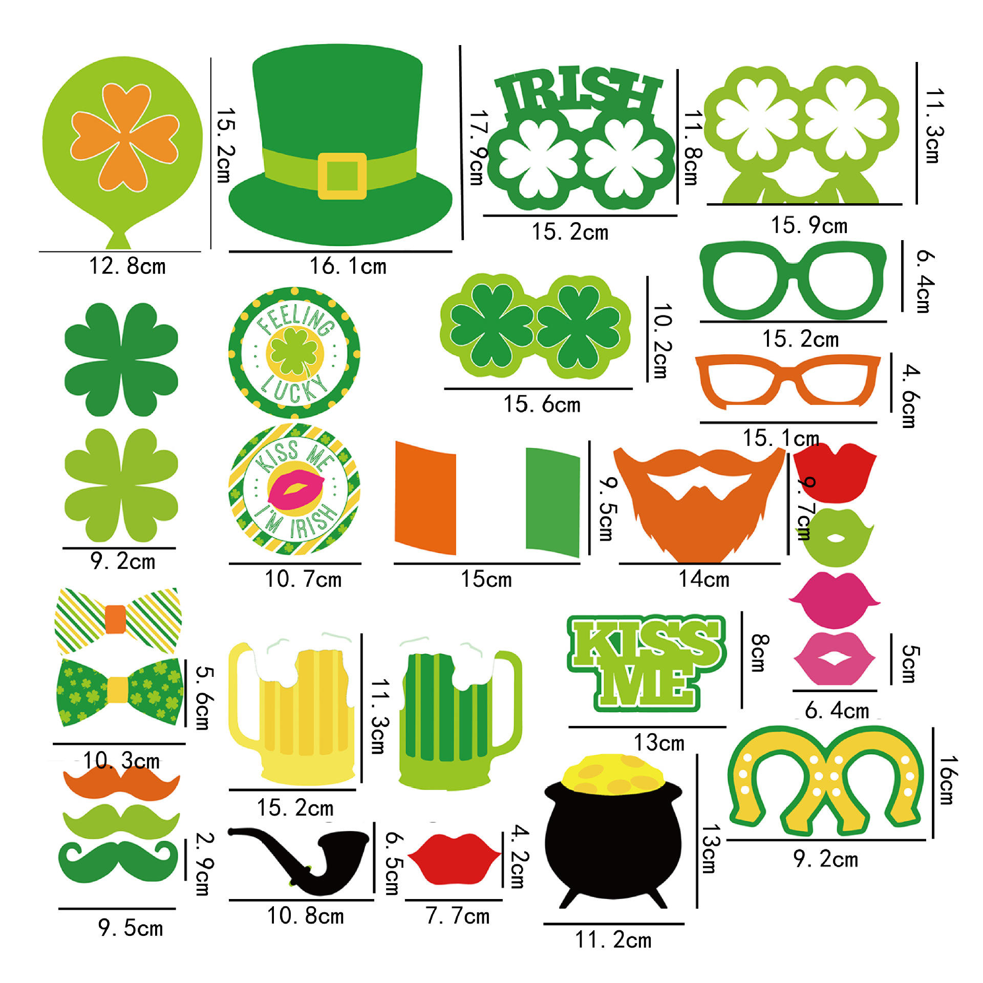 A set of 29 St. Patrick’s Day photo booth props, including a variety of handheld props with rich styles and sufficient quantity, made of lightweight card and wooden sticks, easy to hold, mainly used for photo interactions at holiday-themed parties.