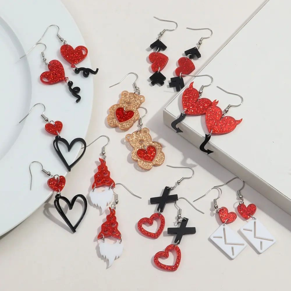 Our Valentine’s Day earrings are made of acrylic material, with a size of 4*1.5cm. The theme is red, highlighting the romantic atmosphere of Valentine’s Day. They feature various patterns such as cartoon demon symbol, heart glitter bear and romantic love letter. Wearing them will make you look more exquisite and beautiful.